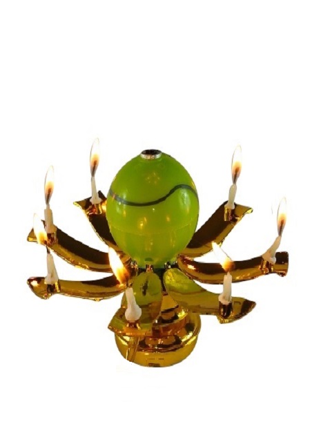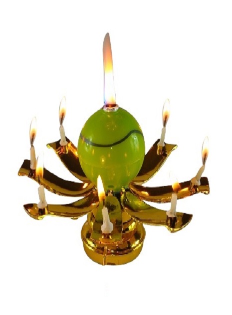 This listing is for the Tennis Ball Golden Trophy Birthday EXCITING CANDLE ®. It rotates slowly in a circular motion, has 8 mini candles attached to the petals, and plays the Happy Birthday melody.
