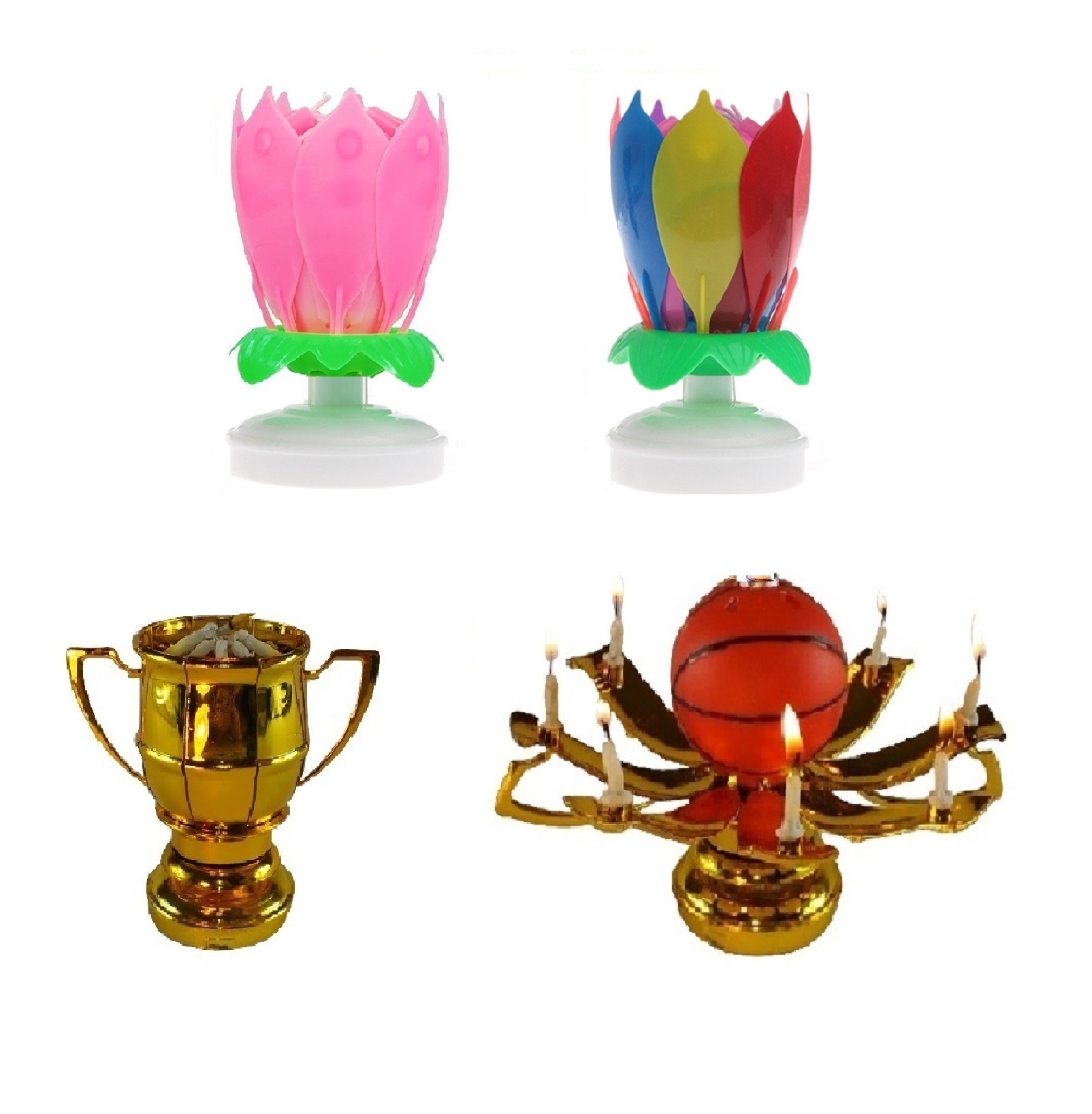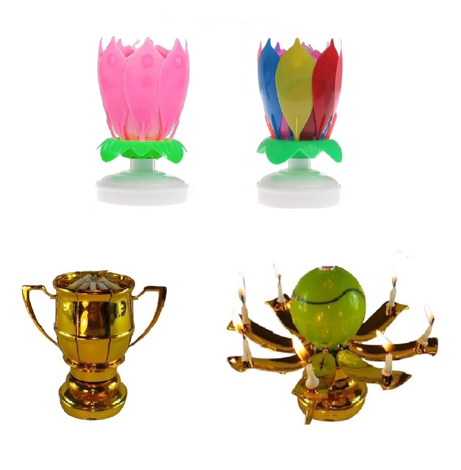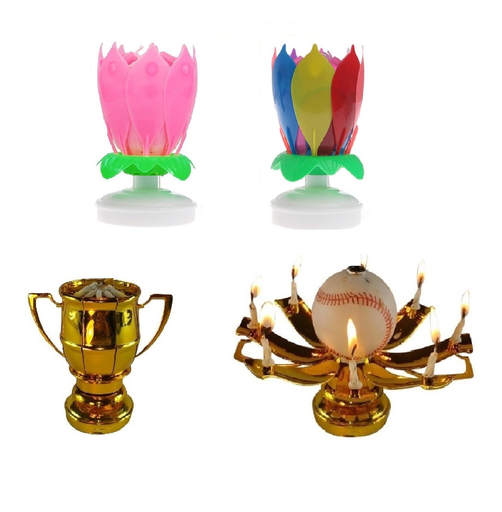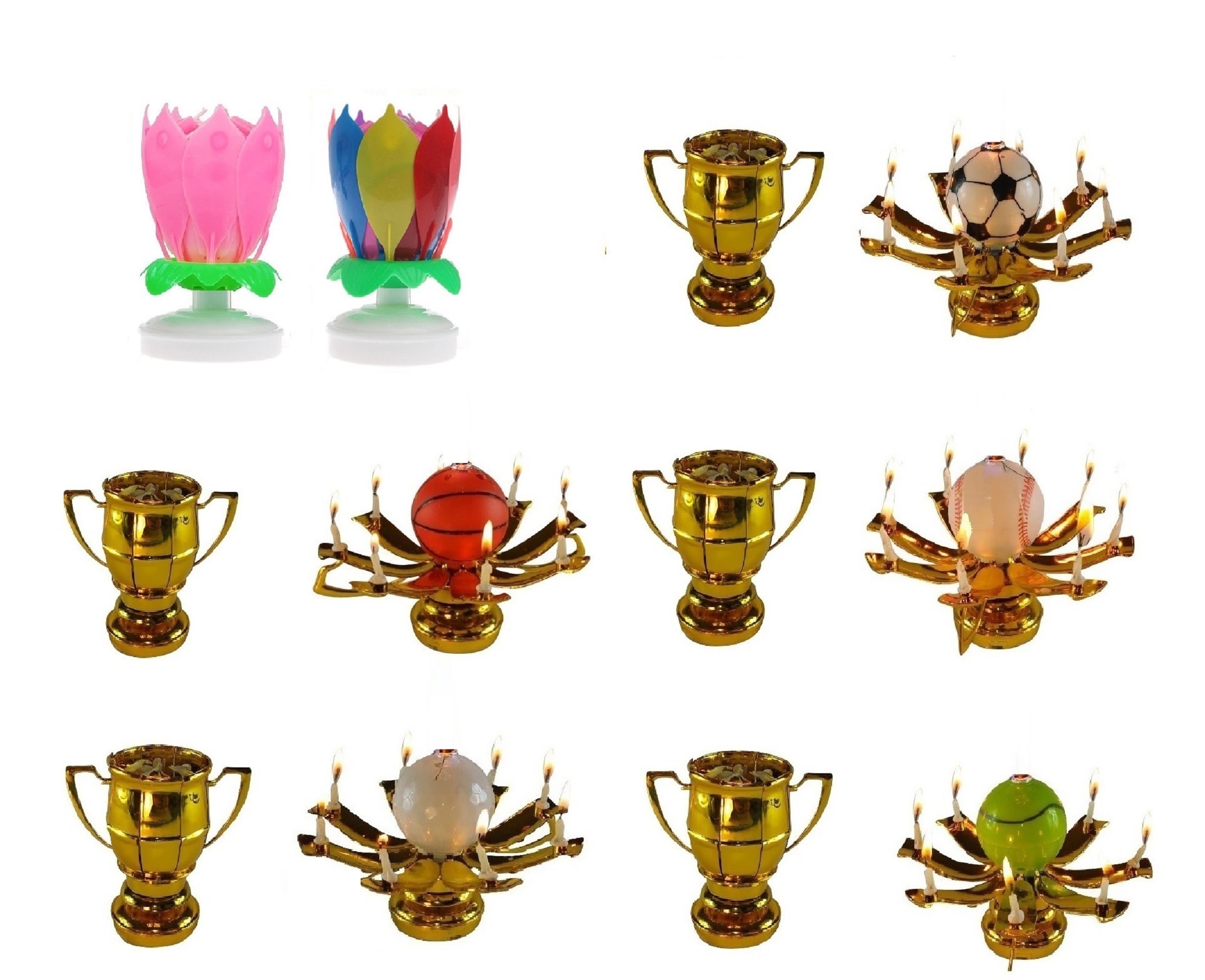 This listing is for 3 total Exciting Candles; the Rainbow and Pink Lotus Flower Birthday Exciting Candle ® and One Sport Ball Trophy Exciting Candle®. Both different styles rotate slowly in a circular motion and have mini candles attached to the petals, and play the Happy Birthday melody.