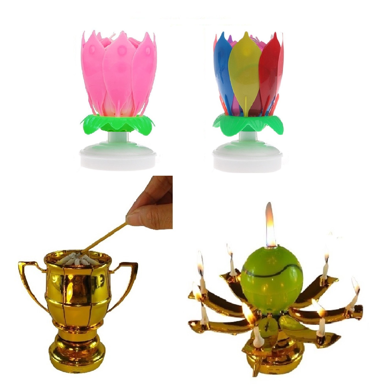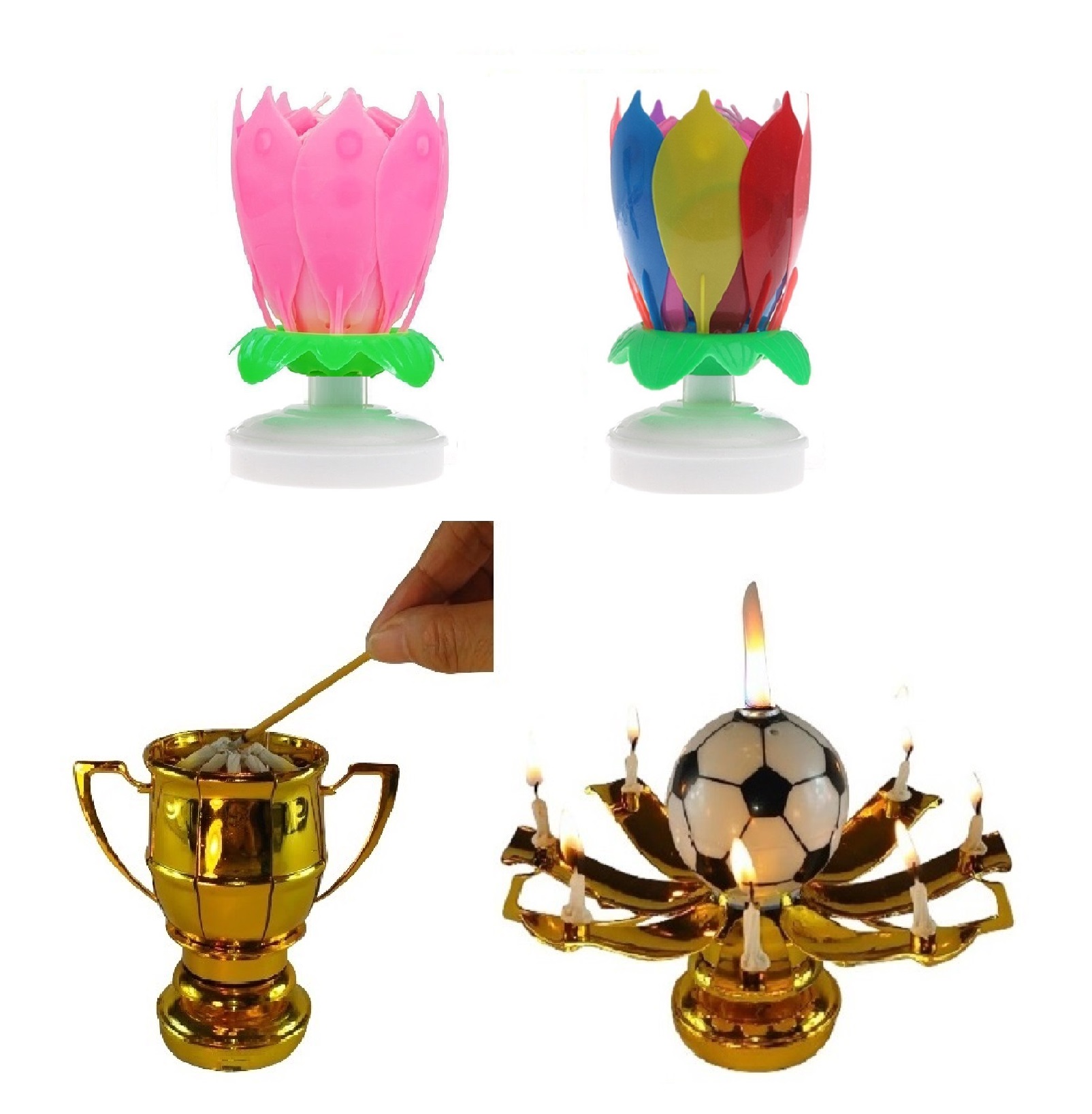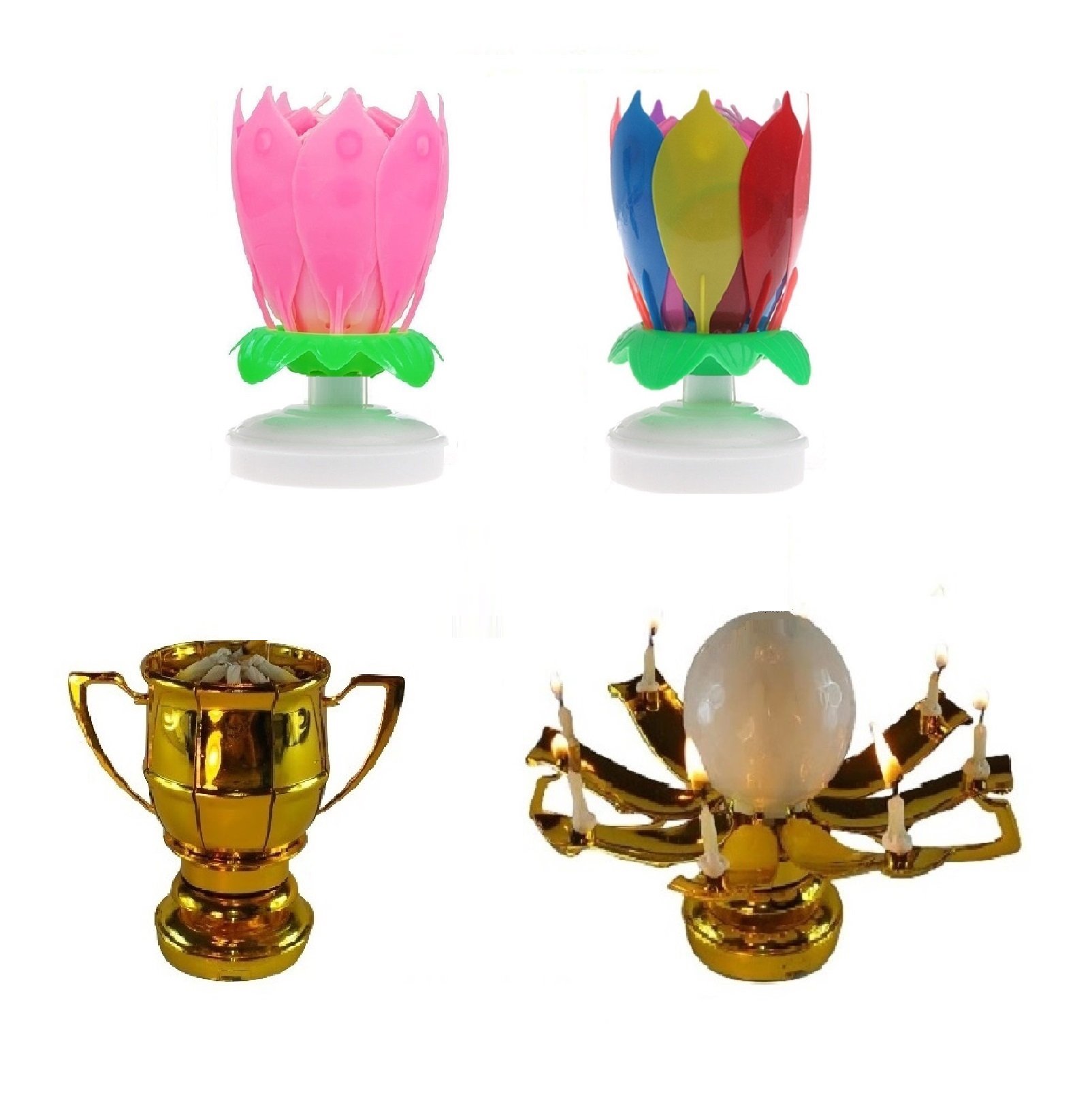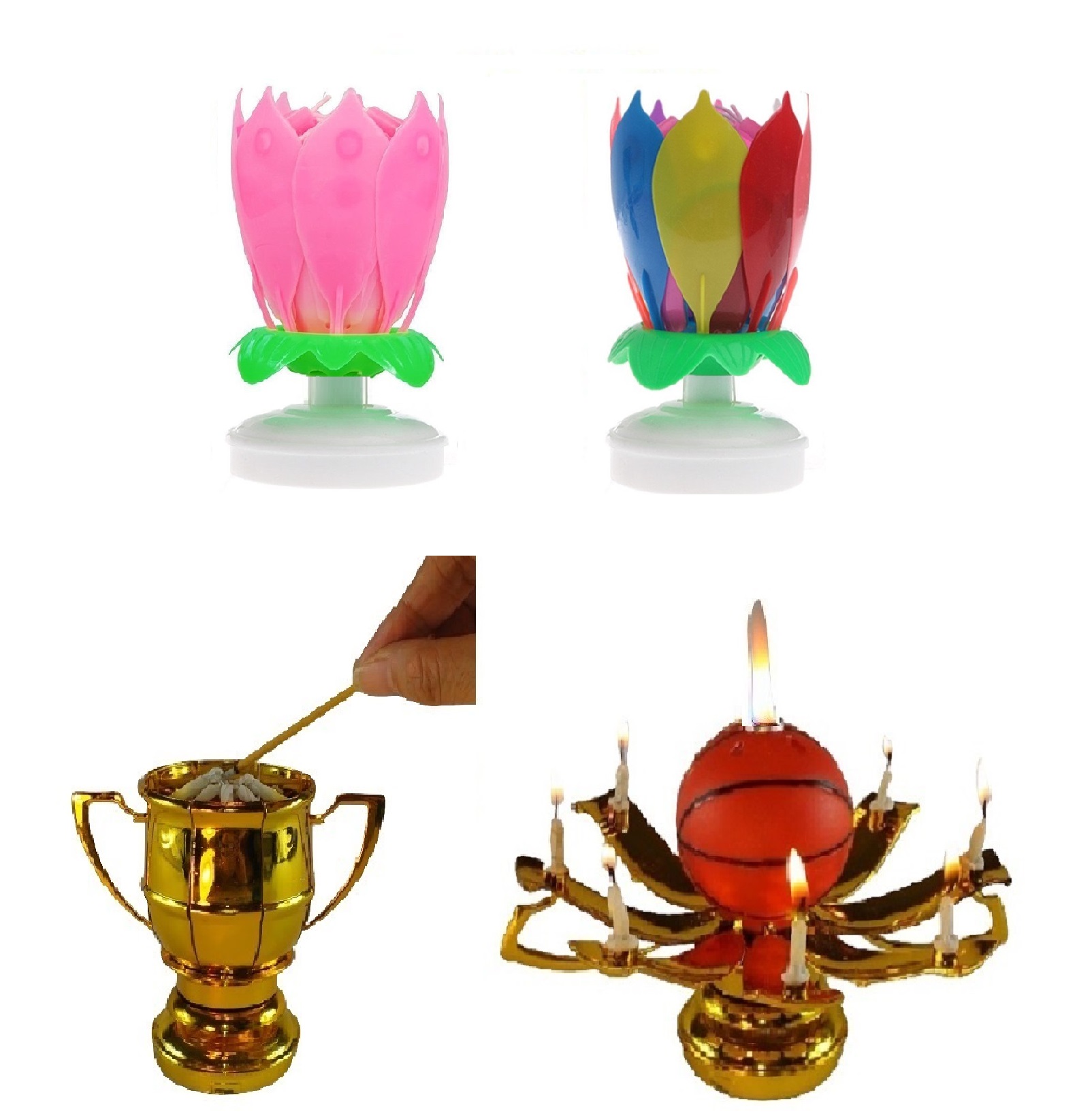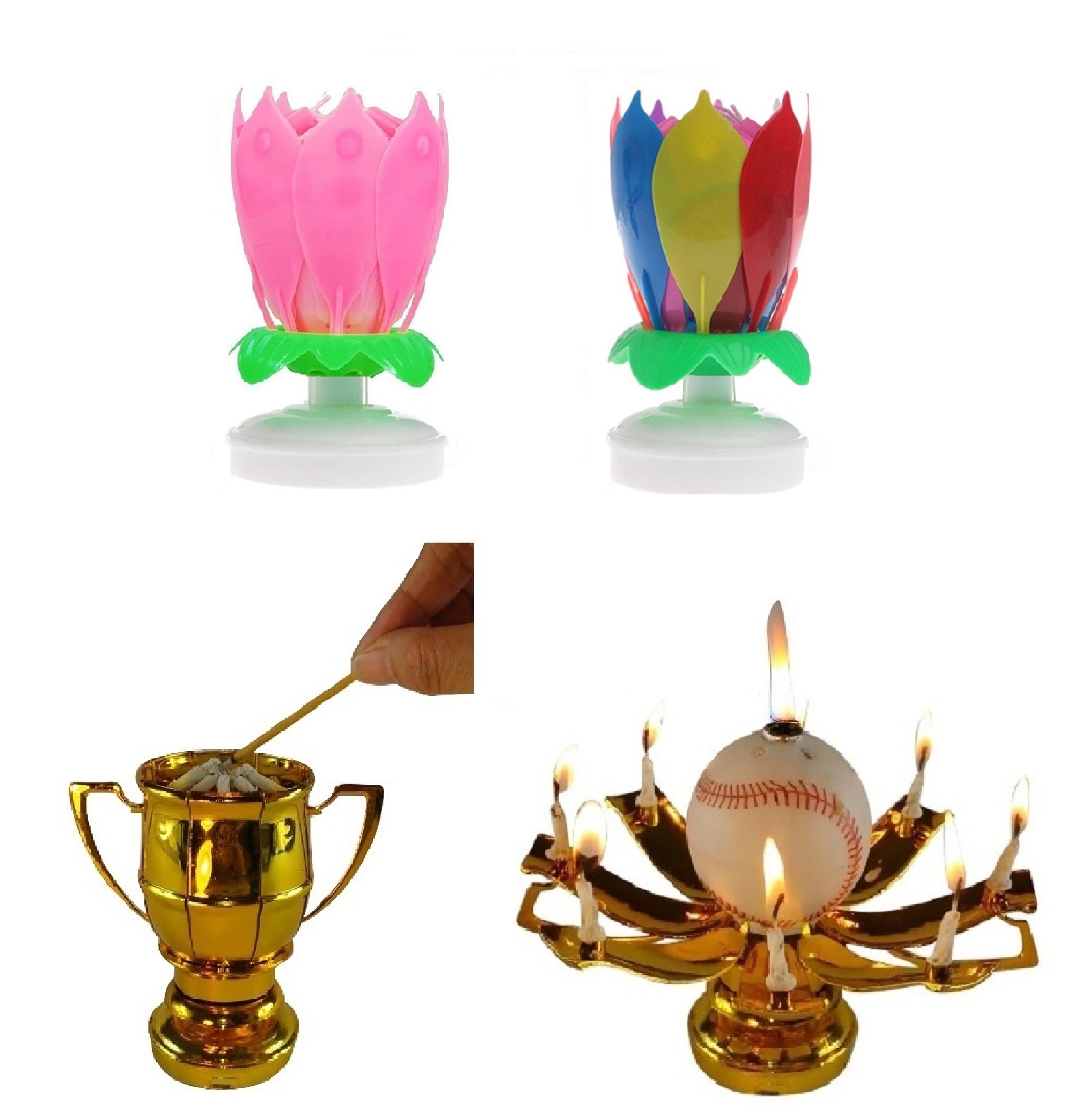 This listing is for 3 total Exciting Candles; the Rainbow and Pink Lotus Flower Birthday Exciting Candle ® and One Sport Ball Trophy Exciting Candle®. Both different styles rotate slowly in a circular motion and have mini candles attached to the petals, and play the Happy Birthday melody.