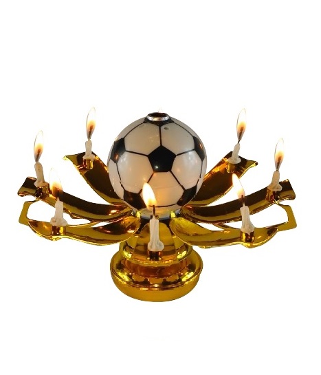 This listing is for the Soccer Ball Golden Trophy Birthday EXCITING CANDLE ®. It rotates slowly in a circular motion, has 8 mini candles attached to the petals, and plays the Happy Birthday melody.