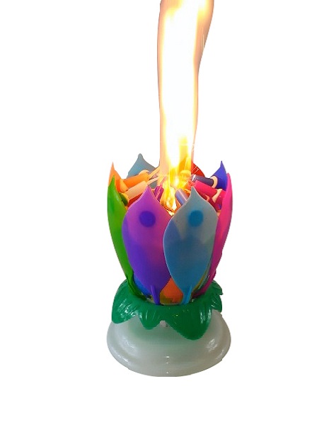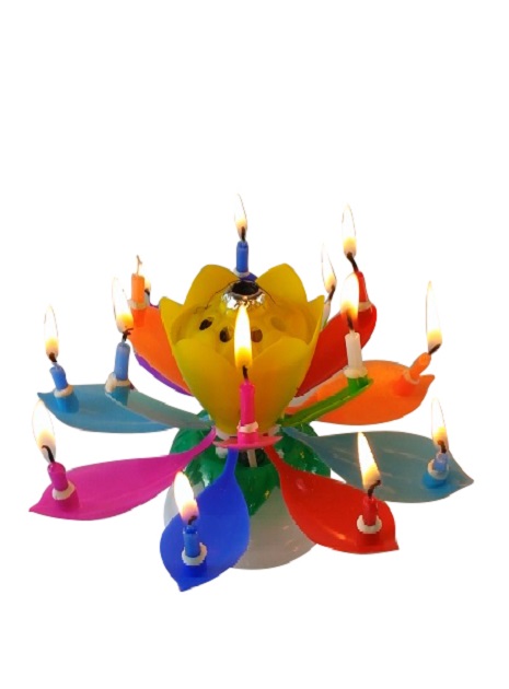 This listing is for the Rainbow Colored Lotus Flower Birthday EXCITING CANDLE ® (with yellow middle). It rotates slowly in a circular motion, has 14 mini candles attached to the petals, and plays the Happy Birthday melody.